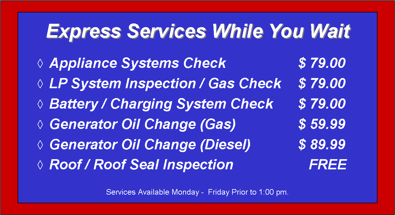 Our Technicians perform top quality repairs at the lowest labor rate in town. We understand how important it is for your Motorhome, Travel Trailer, or RV to be fully operational and available for those precious few days you get to enjoy it. Your RV won't sit for weeks on end in our shop, we strive to get the repairs complete as quickly as possible.